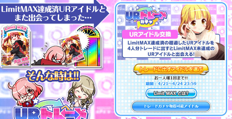 2023年04月22日 【アイドルうぉーず】URトレガチャきたわぁ(∩´∀`)∩だけど・・ もうタイトルどおりなんですけどねwただし・・・イベ産URが餌に使えなくなりました(´;ω;`)イベ産ありだから4枚でもまぁ仕方ないかと思ってたんですが、そうでないならURの価値がSSRレベルに下がっているのに値段換算倍というのはちょっと納得できないところですね。