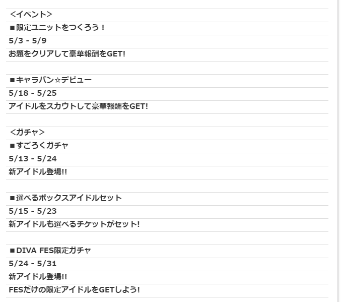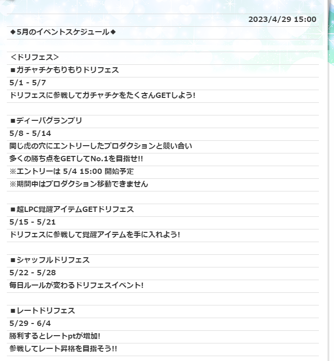 2023年04月30日 【アイドルうぉーず】5月スケジュール(゚∀゚) 5月のスケジュールがでました。といってもGWからみは先月でてるのであんまりネタもありませんがwドリフェス周りは平常運転ですwイベントはキャラバンですね。例によって報酬はMusicです(´・ω・`)誰がきてどんなイベントになるかは楽しみですけどね。いのりん、ももな、うららときてますから、総選挙でいえば28位~51位くらい、って範囲広いなオイ( ゚Д゚)まぁ、アンケ=総選挙じゃないんで予想がつきませんねwガチャの方もいつもどおりなんですが、特殊なガチャって不意打ちだからなぁwあとはGWのログボと経験値CPですね。もう始まってますけどw煩悩は前回のアリスのペースなら今月が乃亜ちゃんのハズ、たぶんw