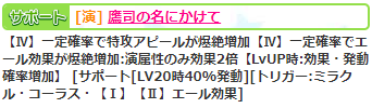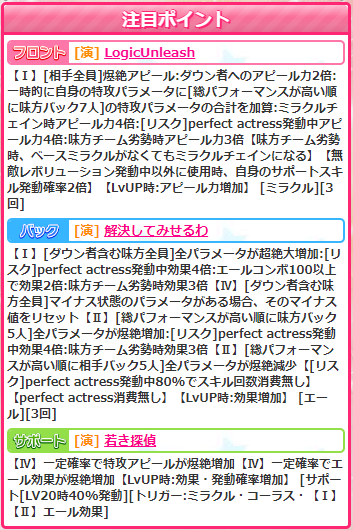2023年04月26日 【アイドルうぉーず】聡明な探偵命【FES】 今月のFESアイドルは命嬢でした(゚∀゚)既にエピクエで登場済みだったので驚きはありませんがwさてスキルです。フロントスキル【LogicUnleash】はミラクルです。LogicUnleashでは検索しても出てきませんでしたけど、Unleashは解き放つだそうです。ロジックを解き放つ、謎は全て解けた!的なやつですかね?w性能の方は倍撃2-4-4-(3)のサポ倍付き。劣勢チェインもあって構成はチリンに似てるんですが如何せん数字が少なすぎますかねー。まぁ、チリンが壊れてるだけなので性能としては悪くない気がします(゚∀゚)バックスキルは【解決してみせるわ】。エピクエでは解決要素はありませんでしたがw性能は消費なし付きのバフ&デバフ。倍撃はバフ側のみなのでバフメインですが、劣勢時の高倍率バフに加えて、リセットもあるのでRPA時のチリン援護には良さそうですね。対象が7人ならもっとよかったですが。サポ【若き探偵】、覚醒【鷹司の名にかけて】。なんか名にかけちゃってるようなのでコナンじゃなくて金田一の方だったぽいですwなお性能は両方とも増加系サポです。全体的に、とりあえず全スキル使い所はあるかなーとは思います。オンリーワンじゃないですけど。サポも爆絶なのでデッキには入れるつもりですけど、尖ったところがないので試行錯誤しがいがないんですよねー(´・ω・`)