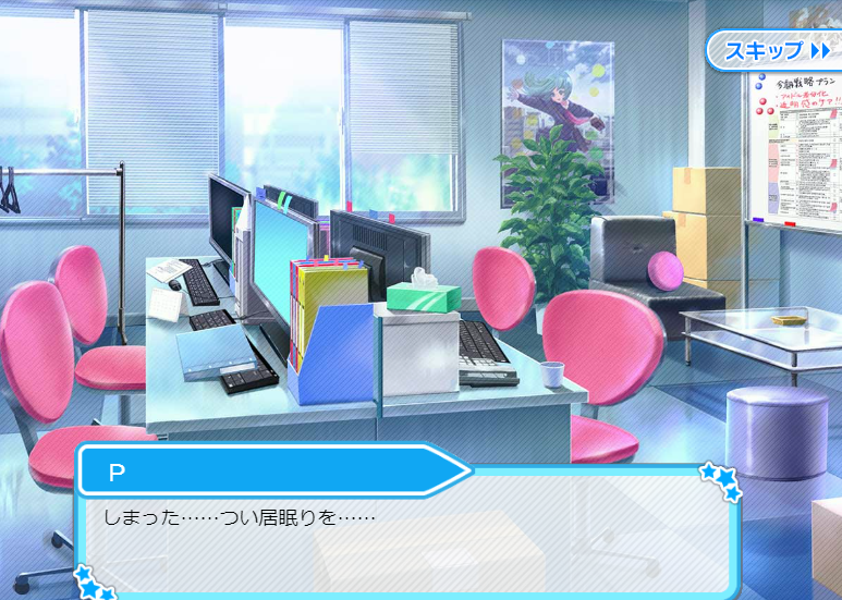 2023年04月25日 【アイドルうぉーず】エピクエ終わり! エピクエ終了です。結果としては一応三つ巴だったんですが、見ててイマイチ盛り上がりませんでした(´・ω・`)お話の展開としては悪くなかったと思うんですけど、やはり悪の組織ぽいやつが必要だったですかねwメインはサイドの2話だと思うんですけどアクション的なやつはやはり紙芝居では厳しかったようです。でもオトギとかは紙芝居でもちゃんと盛り上がりが伝わってる気がするんだよなぁ。カットイン効果かなぁ。と思って確認してみたところ、確かにカットインはあるんですがそれ以上に、表情がこっちは変わるんだった( ゚Д゚)確かに「ぐっ!うぅぅ!」って表情じゃないですしね。技術的には難しくなさそうだけど・・。無理かなぁ(´・ω・`)さてオチとしてはやはりコレなんですけど、個人的にはもう少し練ってシリーズ化してほしかったかなー。コナン的な感じで(゚∀゚)まぁ、夢オチだと続編は厳しそうですねー。今回はミコトとかいなくても困らなそうなポジションでしたけど、せっかくだしもう少し掘り下げて欲しかったかな?