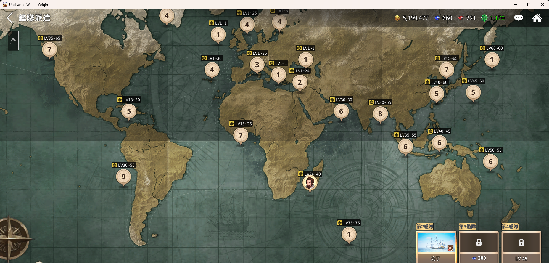 2023年04月23日 【大航海時代origin】レベル40になりました(゚∀゚) 造船ももう少しでレベル10というところまで来ましたが、先に船団レベルが40になりました(∩´∀`)∩ワーイいざマラッカ海峡の向こうへGO!と思ったら、合わせて耐波も75にあがってましたorz手持ちのの船と装備では単騎にしても耐波74までしかいけません。強化ハンノキを買えばギリ届くんですが、同じ値段(150)で耐波55のコルベットが買えたのでそっちを買いましたw早速編成しようとしたところ、ドックの枠が足りなくて船を外せないので、2隻を取引所に仮出品。耐波75が確保できたのでいよいよ、GoGoイーストです(゚∀゚)ノまだ全部回りきってませんが、耐波75エリアは55や65と比べると行ける港がかなり増えますねー。一隻なので貿易は現実的ではありませんがwあわよくば韓国あたりまでと思いましたが、そんなにヌルイわけもなく更に耐波も上がるみたいですw日本にいけるのはいつだろう(´・ω・`)