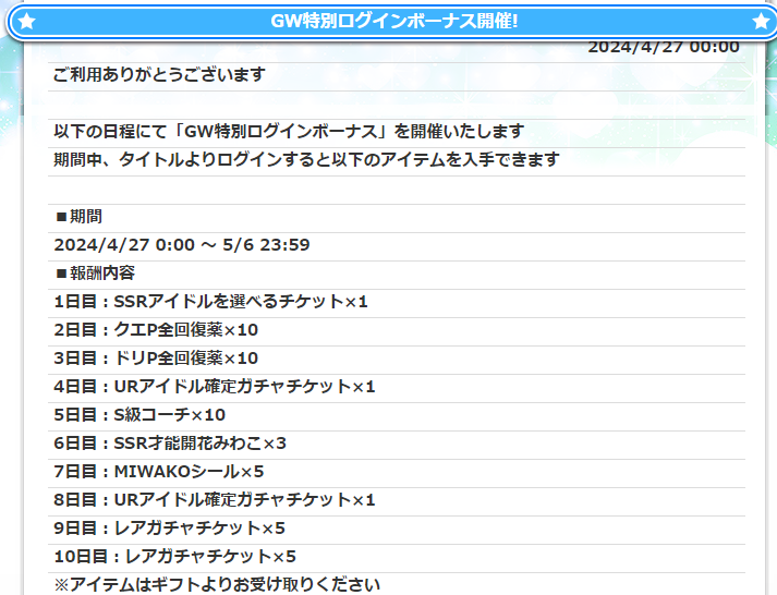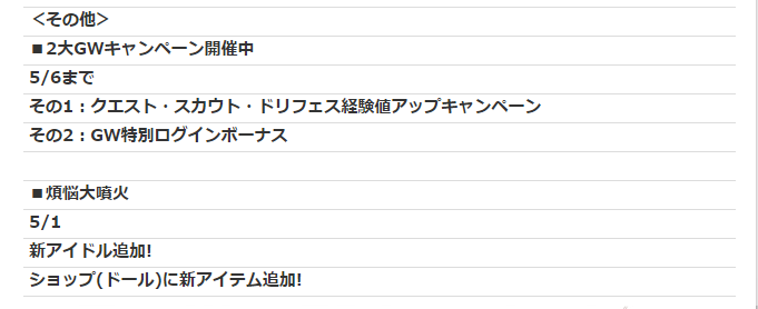 その他は現在開催中のログボ&経験値ボナの続きですね。