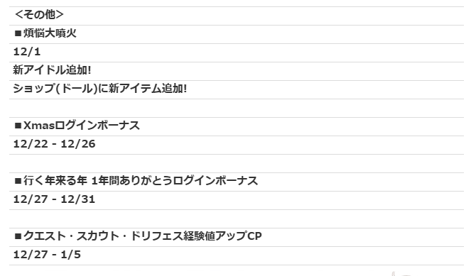 2024年11月29日 【アイドルうぉーず】12月スケジュールがでたよ(∩´∀`)∩ 今年もいよいよ終わり!ということで12月スケジュールです。ドリフェスは書くまでもなくいつもどおりですね。イベント周りは一つだけですがエピクエ。12月のエピクエは2年前の4姉妹夢落ち以来ですね。ネタ的にはクリスマスがらみの可能性が高いと思いますが、パネルの紗南ちゃんがなんか着替え中ぽい感じなのがやや不安ではありますw個人的には忘年会でべろんべろんに酔っぱらってるのとか見てみたいとこですが、そういうのはどっちかというとオトギのノリですねwガチャは福袋再販以外はいつもどおりです。その他では恒例のログボがあります。去年はクリスマスログボがみわ子シールやUR確定チケ、ゆく年くる年は薬品類でした。たぶん今年も同じ感じですかねー。個人的にはゆく年くる年ログボのドールがいくつになるか気になってますw
