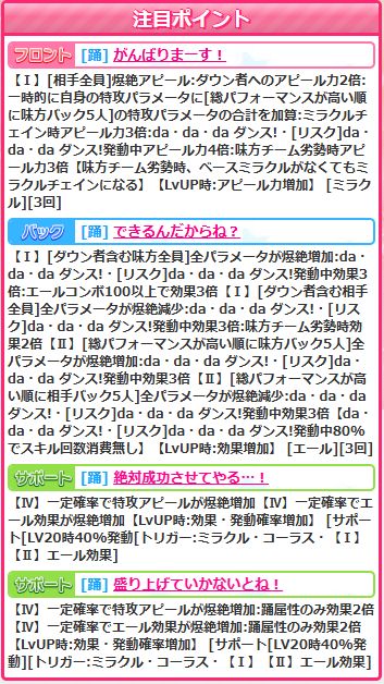 2024年11月25日 【アイドルうぉーず】リズムに乗って雫【FES】 今月ラスト、FESガチャアイドルは雫嬢です。登場自体は一年ちょっとぶりなんですけど、ずっとボックスだったのでまともなガチャ登場は2年半以上ぶり(゚∀゚)折角なので性能ももっと盛ってほしかったですけど、まぁいつおどおりですねwフロントスキル【がんばりまーす!】はミラクルで倍撃が2-3-4-(3)と控えめな上に劣勢チェインのみなのでションボリ砲です(´・ω・`)バックスキル【できるんだからね?】は前後バフデバフの80%消費なしです。最近はこのパターンも多いので珍しくはないですけど使い勝手は良さげです。サポ&覚醒はいつもの増加サポ。全体的に、よくあるフロント死亡のサポ本体、バックもちょっと使える系アイドルですね。サポ&覚醒はもう固定になった感じなので、フロントとバックしか色を出すところがないんですけど、特殊性能が追加されないので、倍撃の時点で死んでるとなんも書くことないんだよなぁ(´・ω・`)