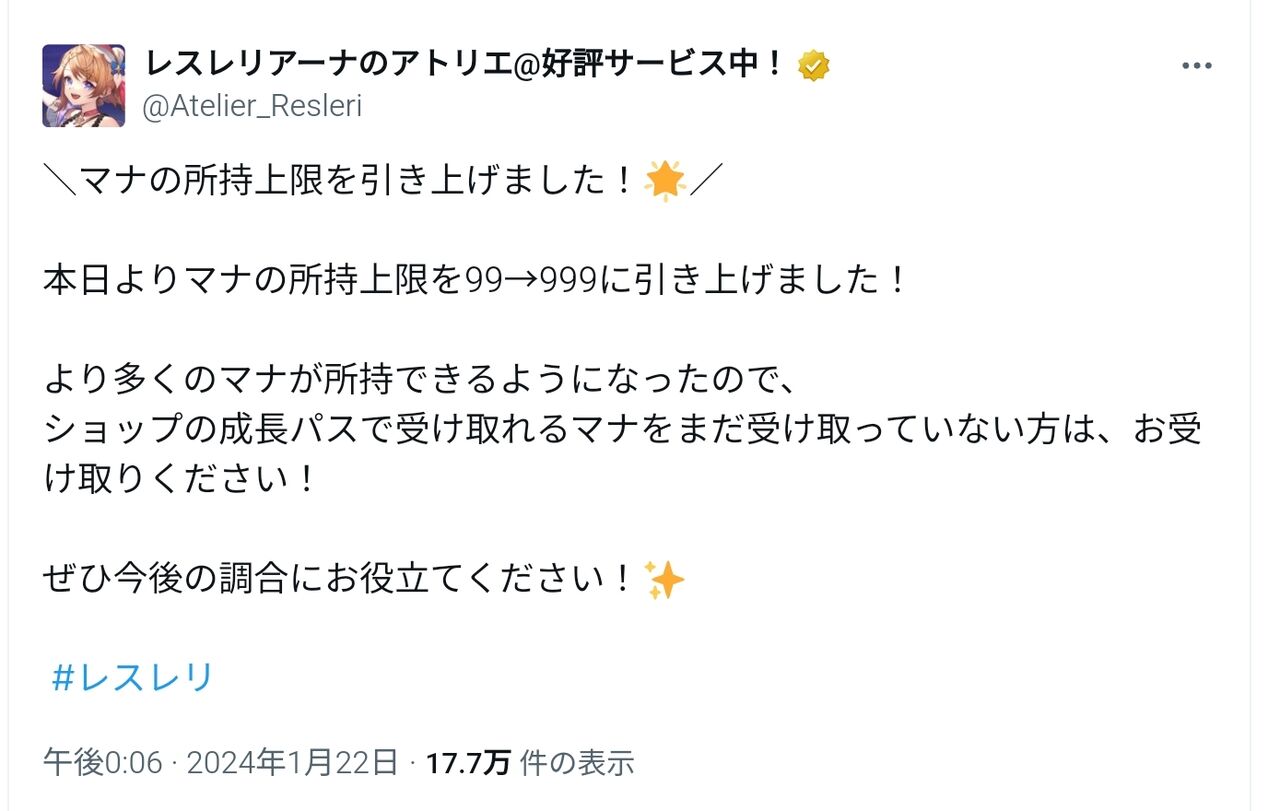 2024年11月27日 【レスレリ】ミッション報酬でマナが溢れる? オチとしては勘違いだったんですけど、気づくまで結構時間かかったので反省の意味も込めてメモ。ミッションの実績報酬をもらおうとするとこの画面↑がいつも出てたんですが、上限増えたはずなのにそれでも溢れるとかミッション一個当たりのもらえる数がそんなに多いんかなーくらいに考えていて、マナ葛藤したらあけるかーとずっと思ってたんですが、今回装備の作成がまとめてできるようになったおかげで今まで尽きることないと思っていたマナがついになくなりました。ということで、満を持してミッションクリア(゚∀゚)増えねー( ゚Д゚)理由がさっぱりで半日くらいネットを調べてたんですが全く情報なし。もしかして問い合わせ案件か?( ゚Д゚)とか思ってたんですけど・・・。気づいた人は最初のところでわかったと思うんですけど、溢れてるのはマナじゃなくてスタミナでした_(:3 」∠)_ レスレリ始めたばかりのマナとスタミナの区別もついていないころに溢れてるのはマナ!と思いこんじゃってたので今まで全然気づいてませんでした。思い込みって怖いわぁw