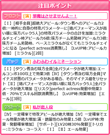 フロントスキル【邪魔はさせませんよー!】はミラクルで火力系の特殊能力なし。SSRは火力面ではURに劣る上にミラクルとなれば使いどころはほとんどないです。今回は劣勢特化のようなのですが、いっそのことそっち方面に突っ走るのも面白いかもですね。過去にデバフをプラスに転化するのがありましたが、バフ借り分も転化して、低い方から借りてやれば、フルバフ並みの攻撃ができますし、弱プロがスコアを稼ぐこともできそうです。言ってもミラクルですから逆転までは行かないでしょうしね。