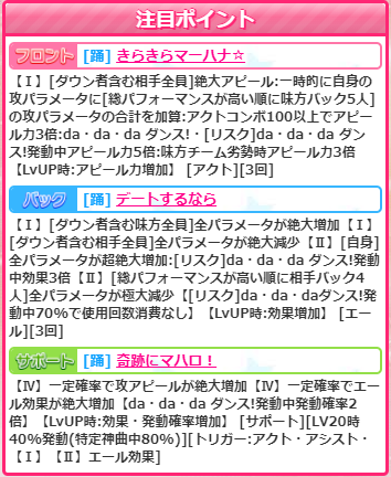 全体的に、SSRなので威力控えめですが、【デートするなら】は個人的にいいなぁと思います。全員のバフ死んだときなんかに上位バフスキル撃つと不在の人のバフだけ上がってることがよくありますしね(´;ω;`)
