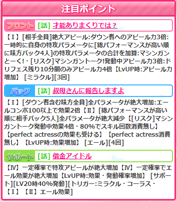 全体的に、報酬アイドルの割には使いどころがある感じです。と言ってもSSRなのでURには上位スキル持ちがいますし、手持ちアイドル次第というところはありますが。