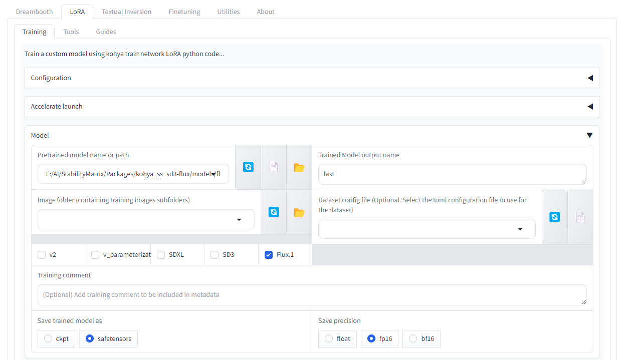 早速インストールを完了させて起動してLoraタブに切り替えてみましたが、ぱっと見変化がないように見えたのですが、モデルにFlux.1のモデルを指定するとその下のモデルのタイプ選択欄が増えてFlux.1が選択できるようになります(゚∀゚)