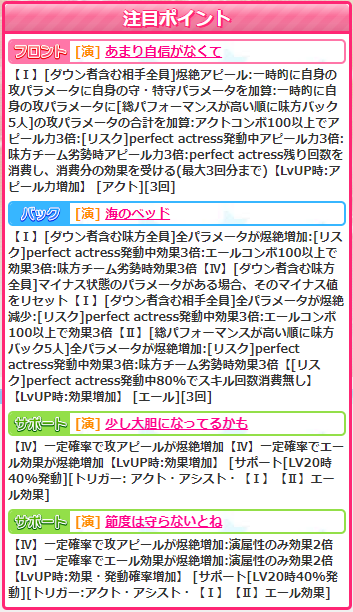 サポ&覚醒はいつもどおりですね。そういえば今回の渚もそうでしたけど、新アイドル紹介のスキル紹介で増加サポが出てくるのはなんだかなぁって感じです。一押しスキルなんで間違ってはないんですけどw