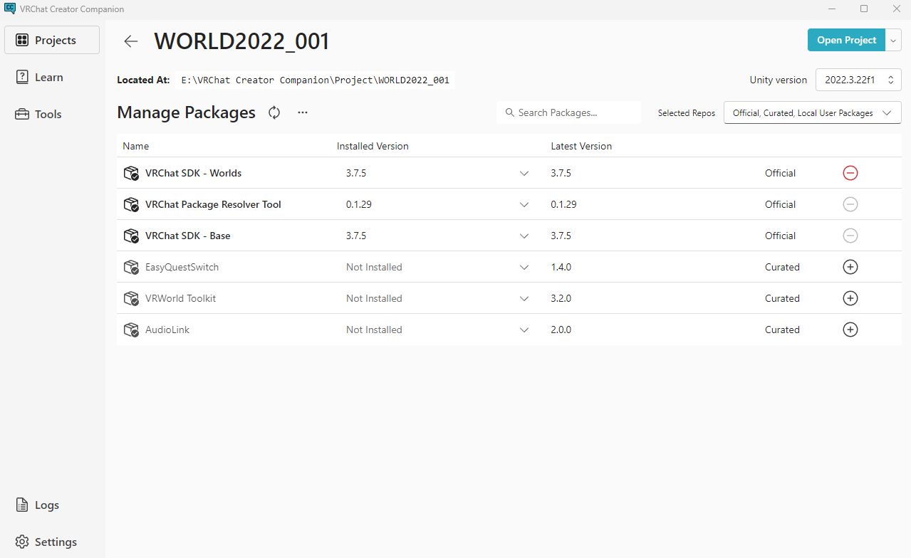 とりあえず2022のWorldsを選択して、プロジェクトの名前とか場所を適当に入力した後、【Create Project】をポチリ。