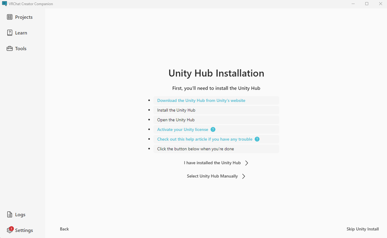 進展しないので前に戻って仕方なく【Install Unity】を選択。