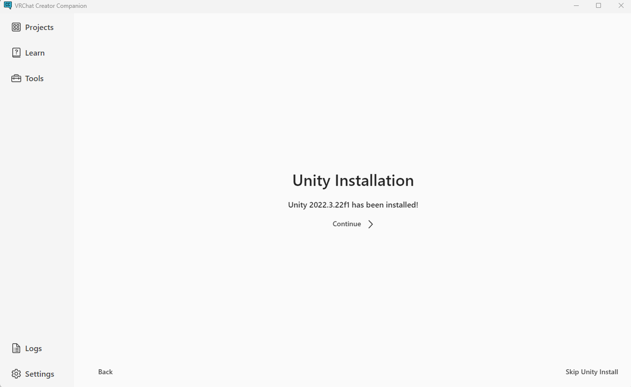以前からUnityはインストール済みなんですけどねー。とりあえず【Continue】。