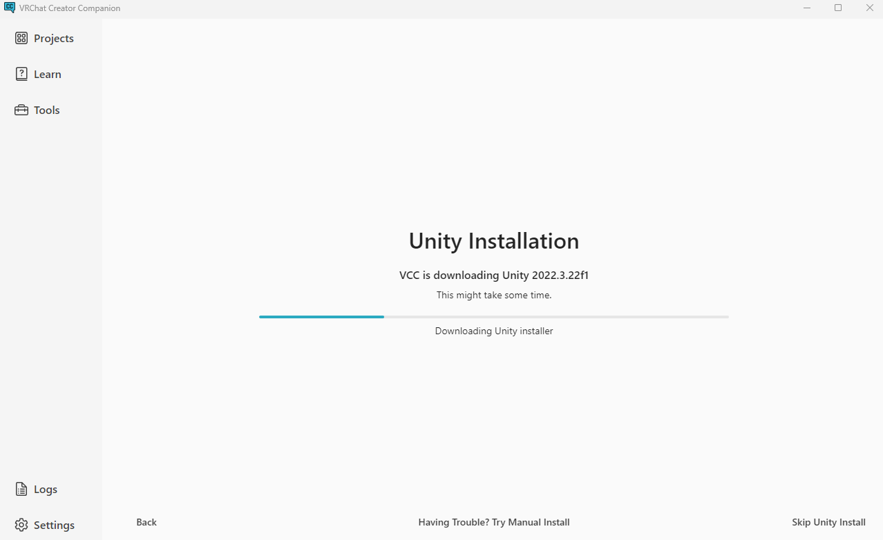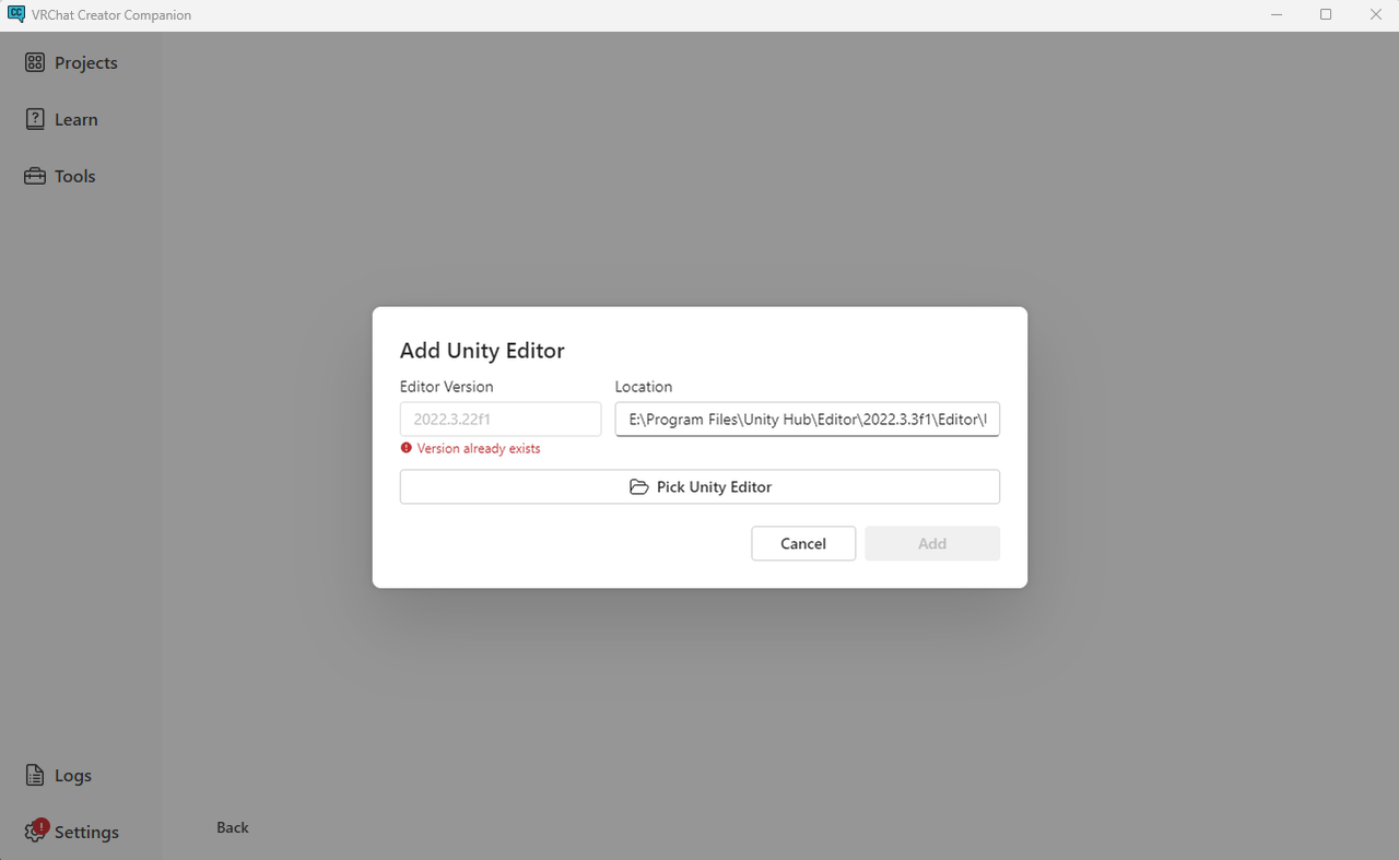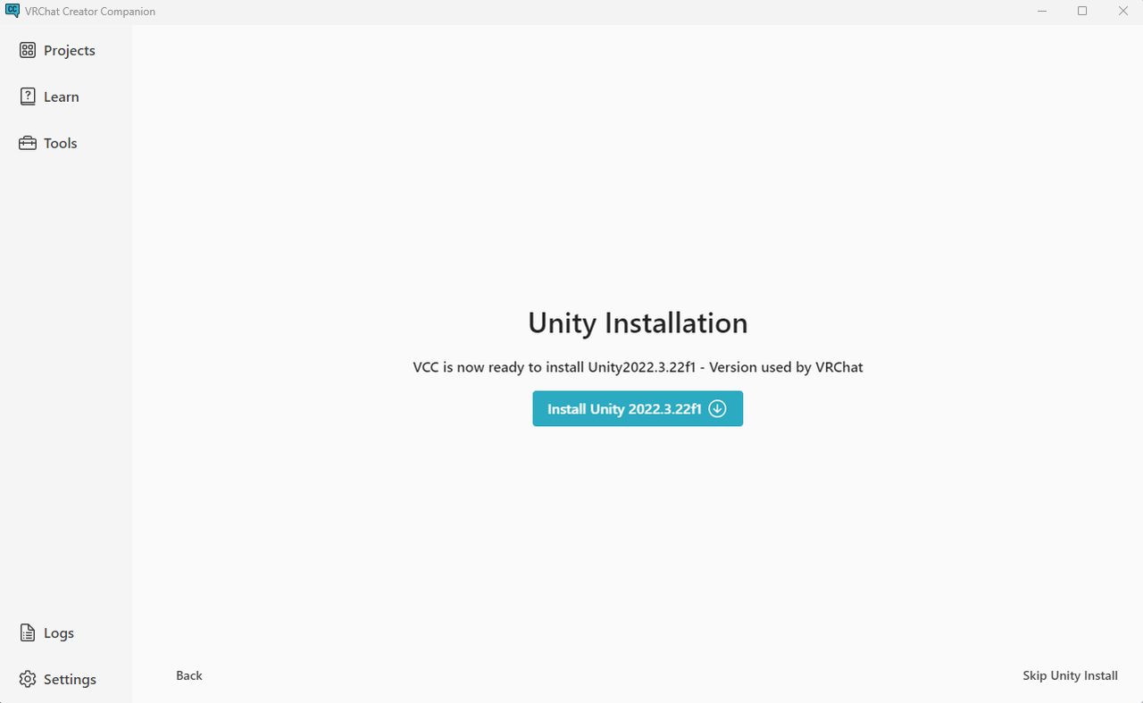 バージョンは2022.3.22f1が必要ってことなんかな?このバージョンは入ってなかったのでそのままポチリ。さっきのVersion already existsはVCCで認められてるバージョンを選択しないとダメだったってコットなのかなぁ。