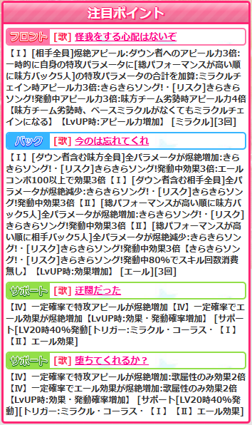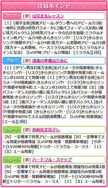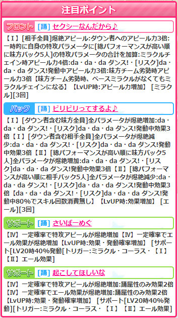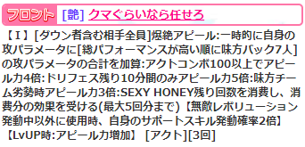 フロントスキル【生徒指導は不要】は爆絶ミラクルで3-3-4-(2)の劣勢倍撃。ミラクルでこの倍撃だとちょっとツラいですね。チリンが3-6-6-(3)で劣勢倍撃もサポ倍もついてますからねー。