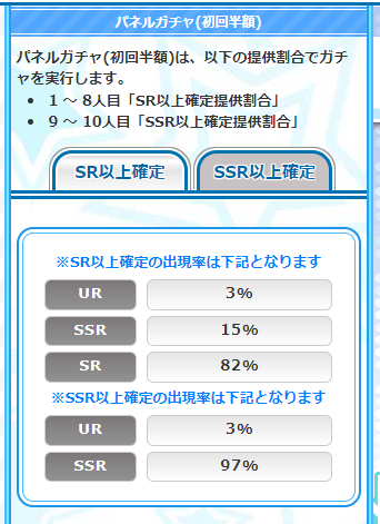 10%ででるようになったとはいえ、運が悪ければ2万7000円引いて10%なのでまだまだコスパは悪いですよねー。せめてすごろくガチャみたく最初の一回くらい500円で10%チャレンジできるようにしてくれたらなぁ(´・ω・`)