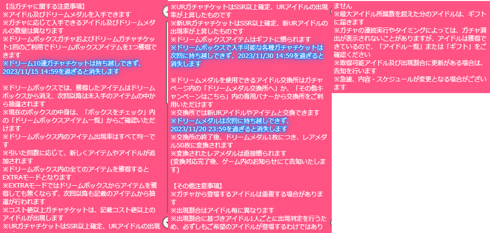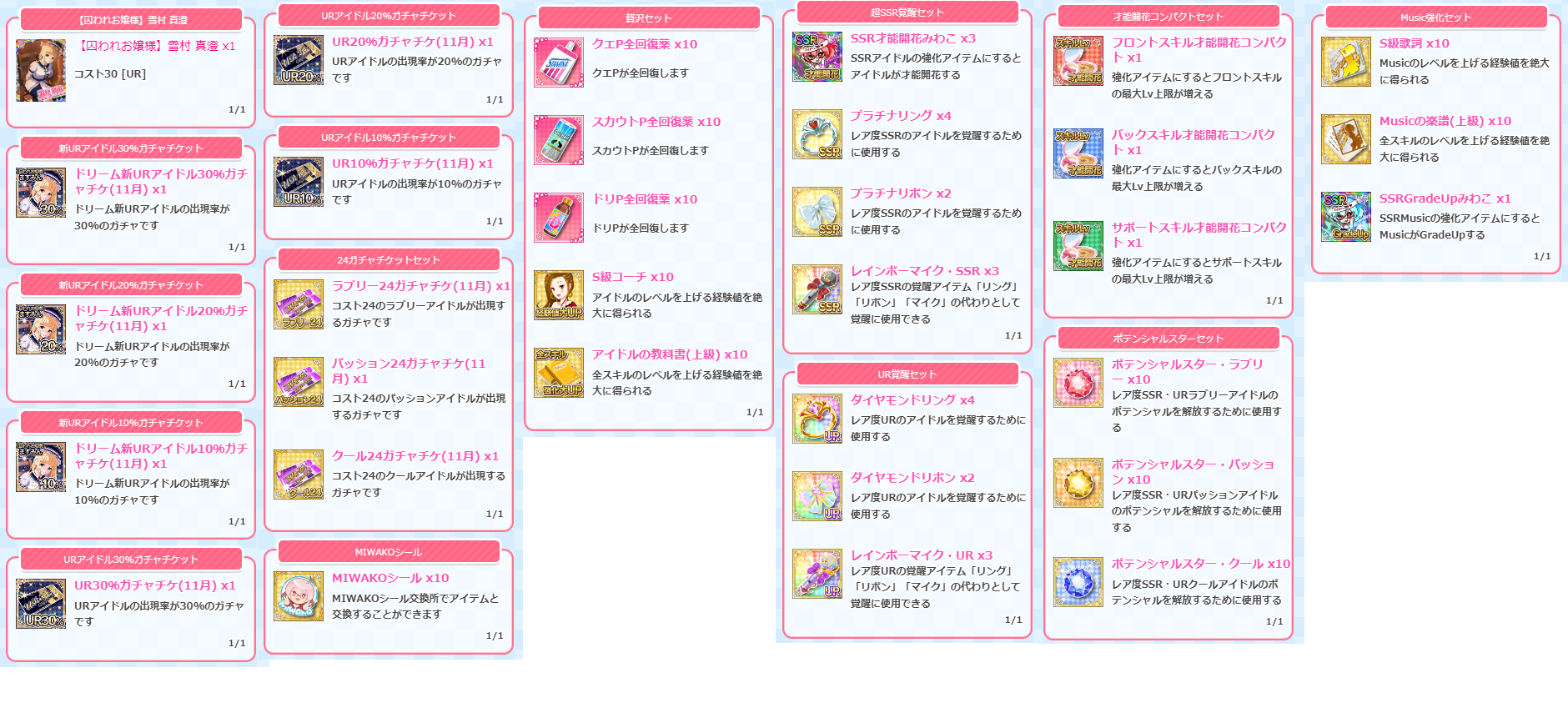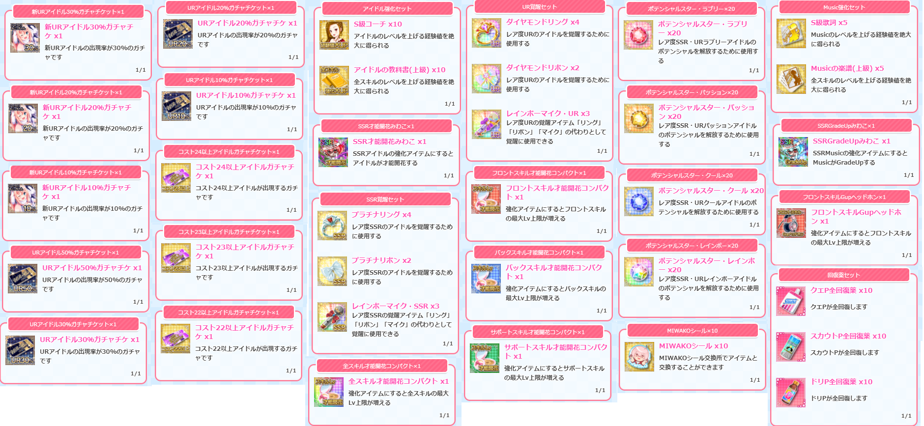 次にボックス内のアイテムの数。以前は27個だったのが15個に。前回のだとパネル3回分引いても新アイドル確定しませんでしたけど、今回は半分近くに減ったので新アイドルがかなり入手しやすくなりました。UR排出率自体以前より上がってますので自引きもしやすくなってますしね。