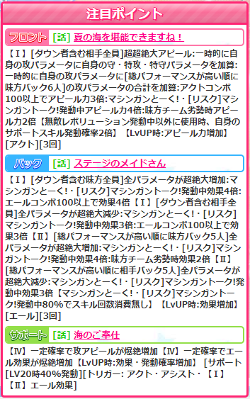 ボックスなのでそもそも火力は微妙なんですが、フロントスキル【夏の海を堪能できますね!】はサポ倍付きなので見かけよりはアピでそう。といっても倍撃3−4−(2)ですけど。