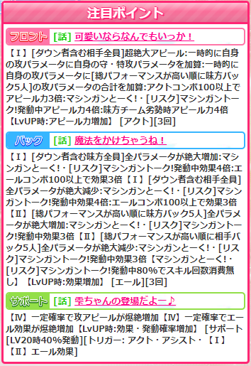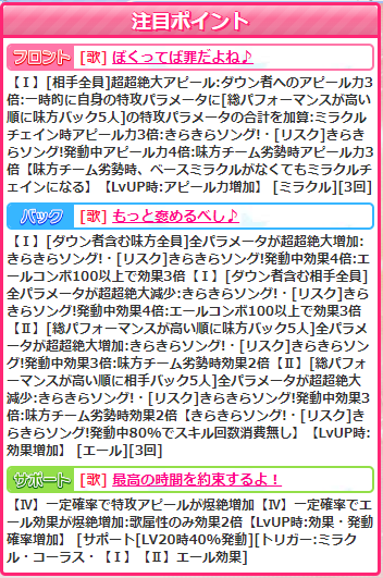 フロントスキル【皆でハイタッチ】はミラクル。先月のうららに似てますね。踊系にはなってますけど。どちらにしても使わなそうですが。
