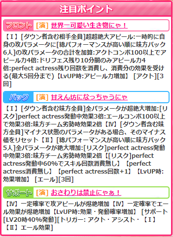 バックスキル【甘えん坊になっちゃうにゃ】が演の連打リセット&バフでかろうじて使えるかなーと思ったんですが、残念ながらこちらは普通に上位スキルあり。