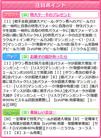 バックスキル【お菓子の国があったら】あたりはリ話他で消費なし90%の5人対象バフ&6人対象デバフなので悪くはなさそうです。覚醒までして使うスキルかと言われるとアレですけど。バフとデバフの人数が逆だったらまだよかったのになぁ。