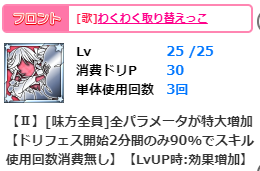 フロントスキル【サービスライブ】は絶大に5バック、最大8倍撃、必要アクコンも300と一昔前のスペックなのですが、無敵外サポ倍は強力です。このスペックはD渚の【貴方さえいればいい!】と同じですね。