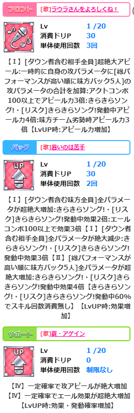 バックスキル【暑いのは苦手】は、フロントデバフはついてますが、基本はバフスキルですね。バック5人に歌系神曲で4倍撃バフの60%消費なし。スゴく強力というものではないですが交換アイドルとしては十分な性能な気がします。