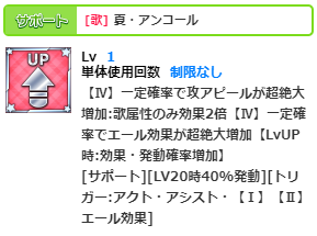 ↑こういうことです。覚醒スキル【夏・アンコール】、こいつもサポ系で、交換アイドルにして攻エールWサポアイドルとなってます。エピクエいのりもWサポでしたけど、こちらは両サポ40%発動なので更に強力ですね。